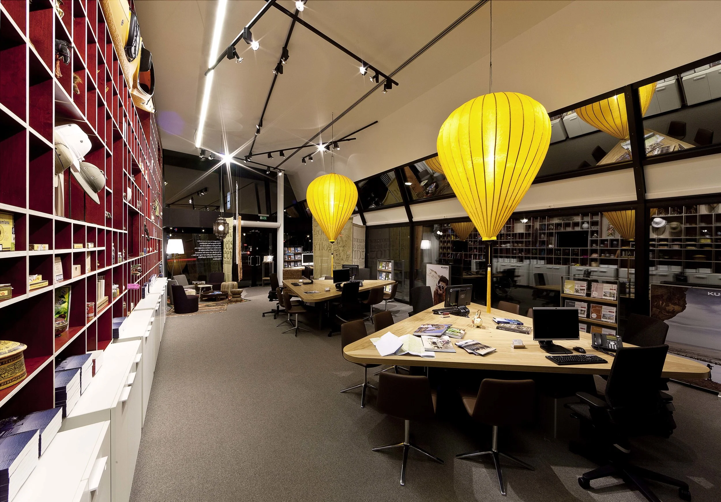 Inspired by the large-scale glazing, we developed a shelf system, a so-called mood wall. The mood wall resembles an over-sized, 12 by 4.5 metre showcase, which shifts the inspirational area partially to the outside. As a result, shoppers catch a glimpse of Kuoni's creative image just by passing by. The concierge desk is made of rattan wicker which creates a warm and exotic atmosphere. Triangular-shaped consulting tables were chosen in order to facilitate easier communication across a corner with a customer when planning a trip. Two large silk lampions hanging over the tables accentuate the area. There is a separate room which is ideal for events for up to 30 persons. The two VIP rooms, a special feature at the Amsterdam flagship store, are entirely in the spirit of Kuoni's premium positioning as they offer a more private atmosphere for planning journeys.